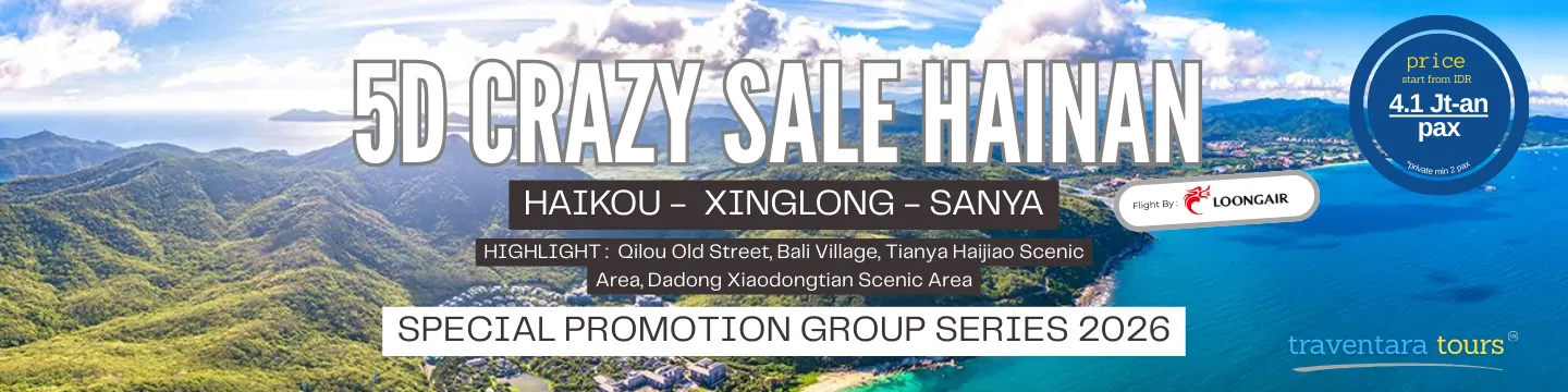 street 骑楼老街, Setelah makan siang, kita akan berangkat ke Xinglong dan mengunjungi Bali Village 巴厘村. Di sini, kita bisa mendengar musik yang meriah, menonton tarian yang memukau, serta mengalami budaya orang Indonesia yang kembali dan menetap di sini. Setelah makan siang, Anda akan melakukan tur berkeliling di wilayah hotel mewah Haitang Bay, kemudian menuju Pantai Yalong Bay untuk menikmati laut yang tak ada habisnya. Setelah itu, Anda akan check-in ke hotel di Sanya untuk beristirahat.